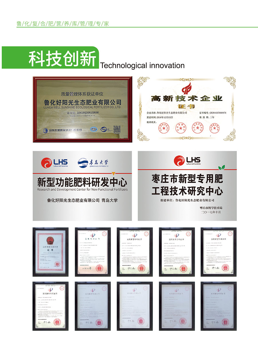 魯化好陽光秉承“營養庫管理專家”的理念,致力于肥料的高效利用,服務農業生產。魯化好陽光已獲得國家高新技術企業認證、ISO9001質量體系認證等多項管理資質證書。和青島大學、滕州市馬鈴薯品牌培育產業發展研究所等多所大學、研究機構合作,建立新型肥料研發中心,取得了豐碩成果。